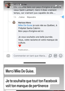 L’internaute, manifestement irrité par le fait qu’elle réside désormais à Saint-Lambert, a franchi une limite en insinuant qu’elle devrait « retourner dans son pays d’origine ». Une attaque discriminatoire et totalement infondée.