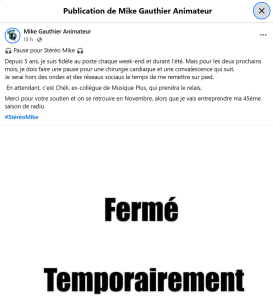 « Depuis cinq ans, je suis fidèle au poste chaque week-end et durant l’été. Mais pour les deux prochains mois, je dois faire une pause pour une chirurgie cardiaque et une convalescence qui suit. Je serai hors des ondes et des réseaux sociaux le temps de me remettre sur pied. »