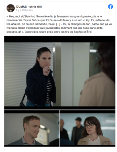 Lundi soir, les téléspectateurs d’ICI Télé ont eu droit à un nouvel épisode de la série Dumas, dans laquelle Marie-Lyne Joncas incarne Sophie Lacoste.